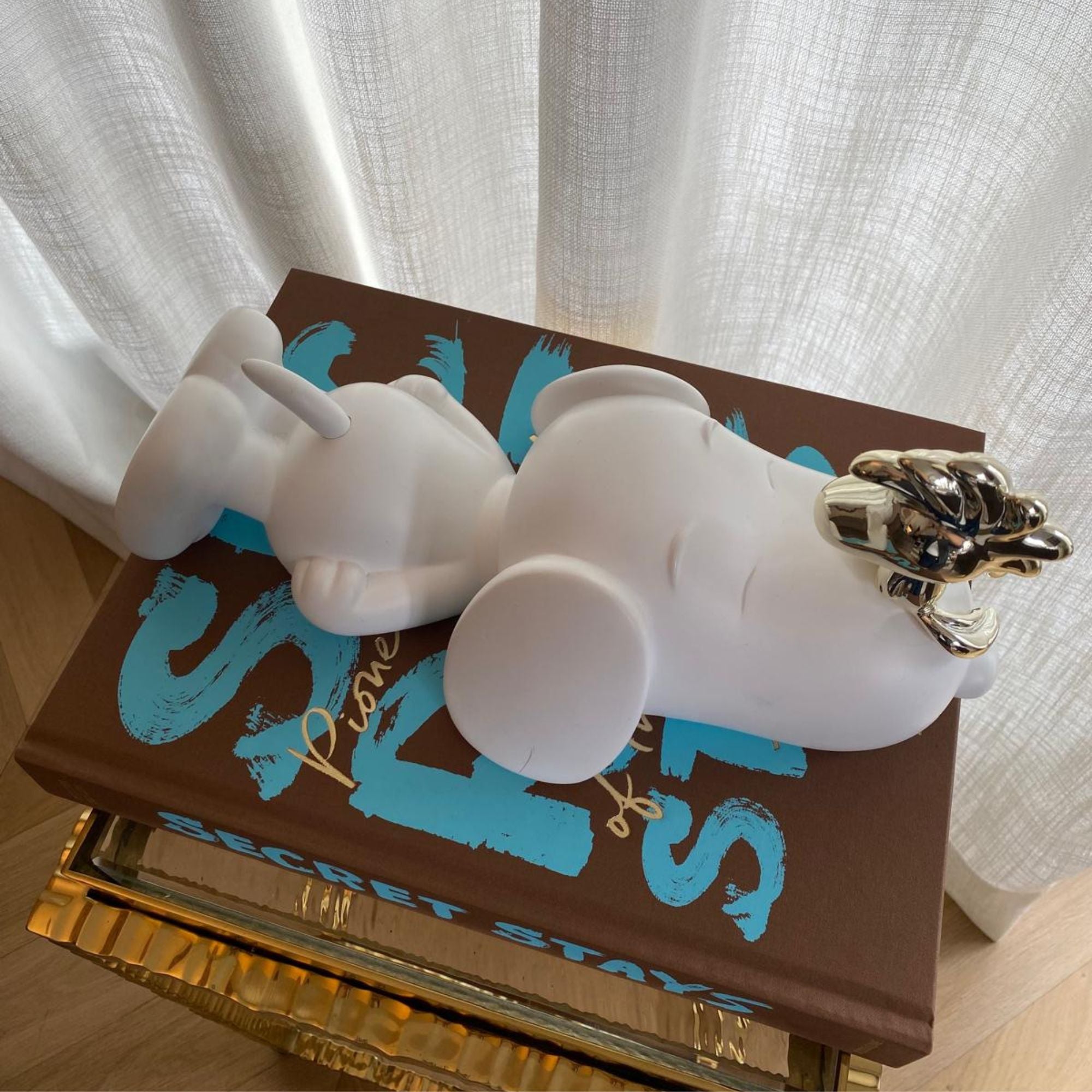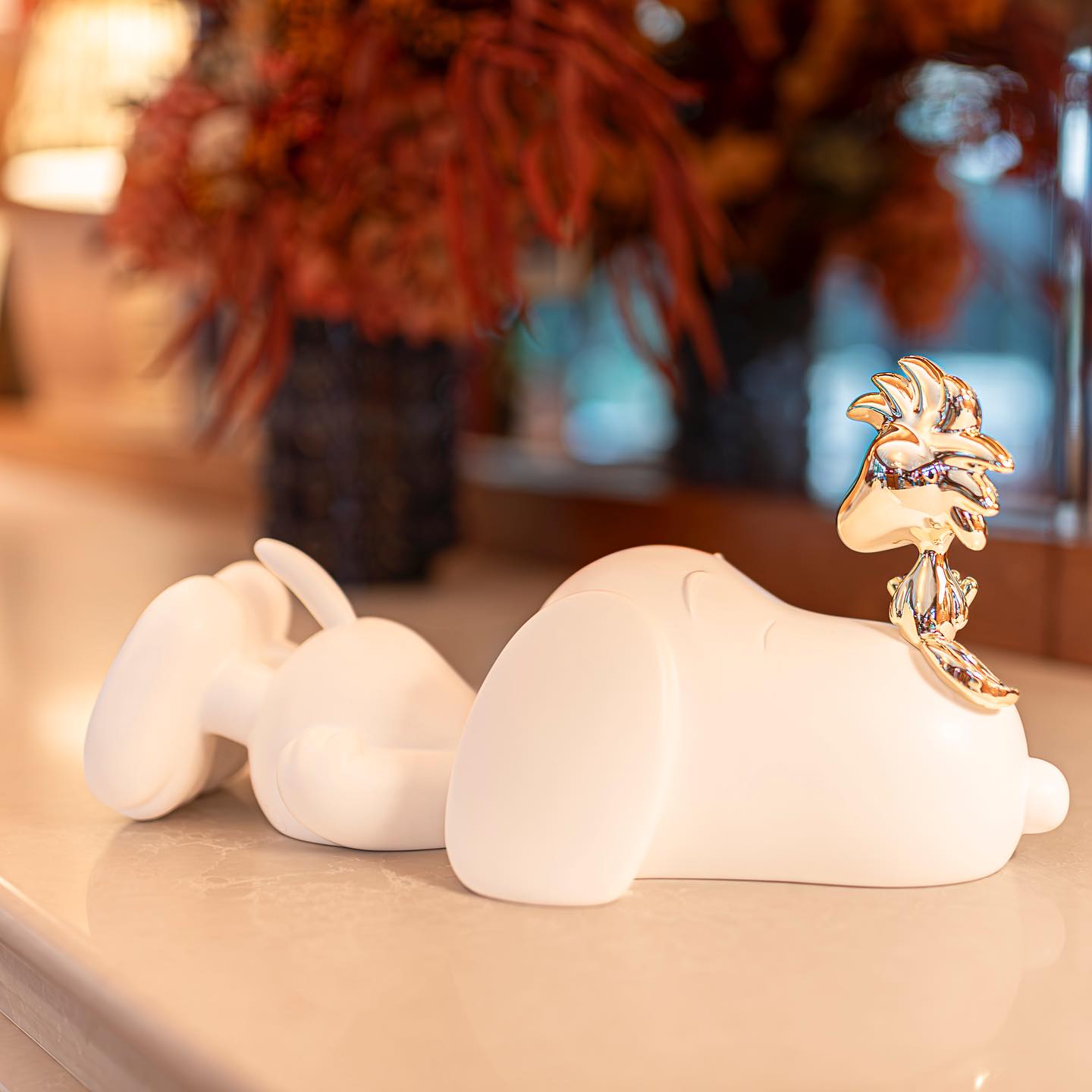 - Snoopy in matte white with a radiant gold Woodstock.