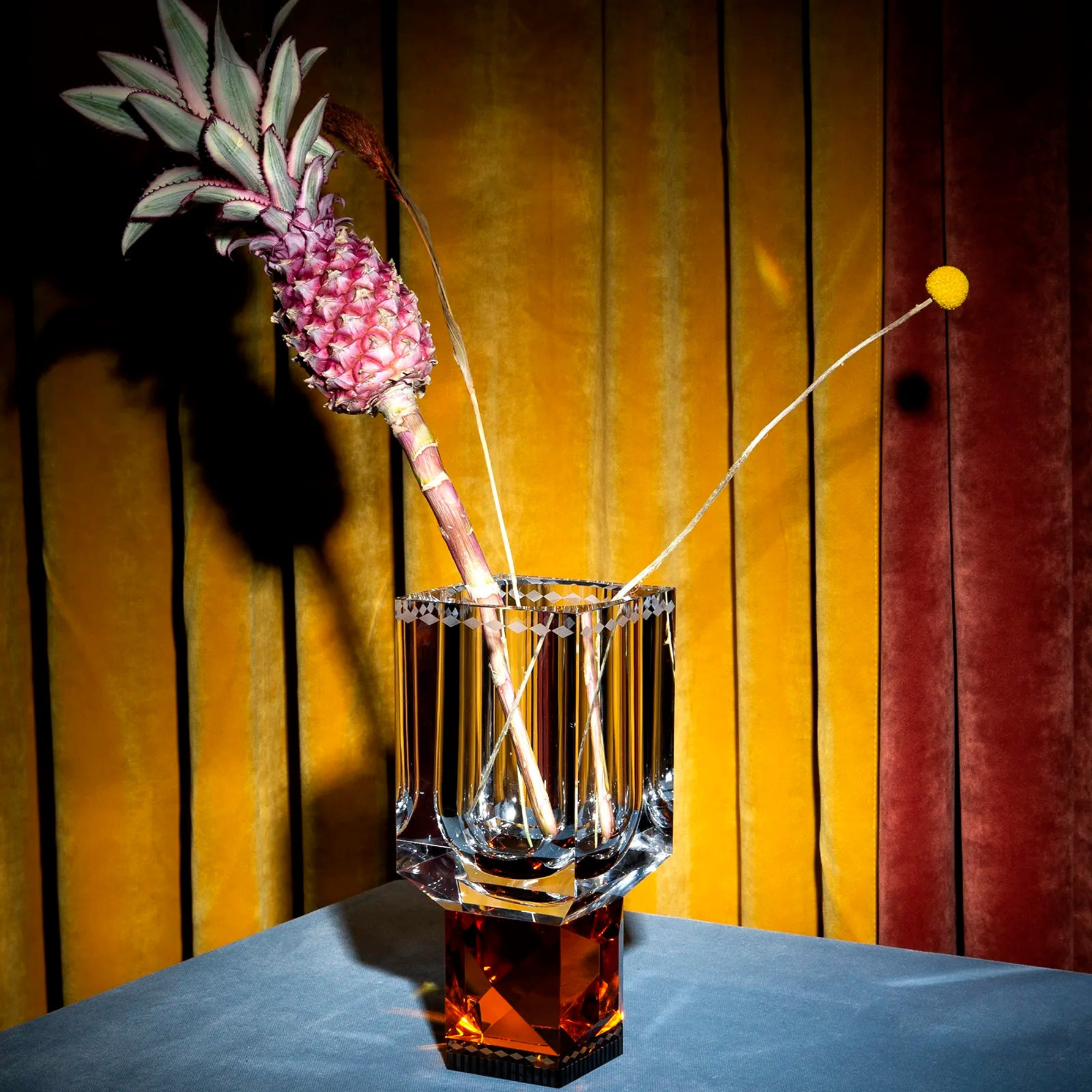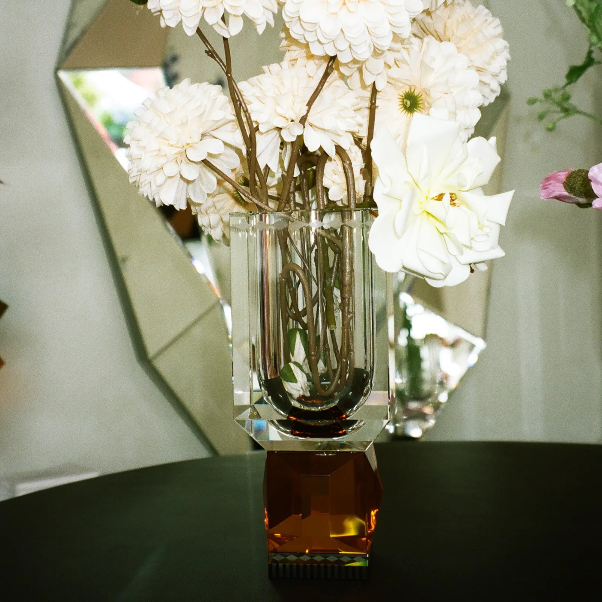 amber-hued crystal, the striking Ohio vase is additionally mesmerizing for the refractions of light that filter through its geometrically patterned surface.