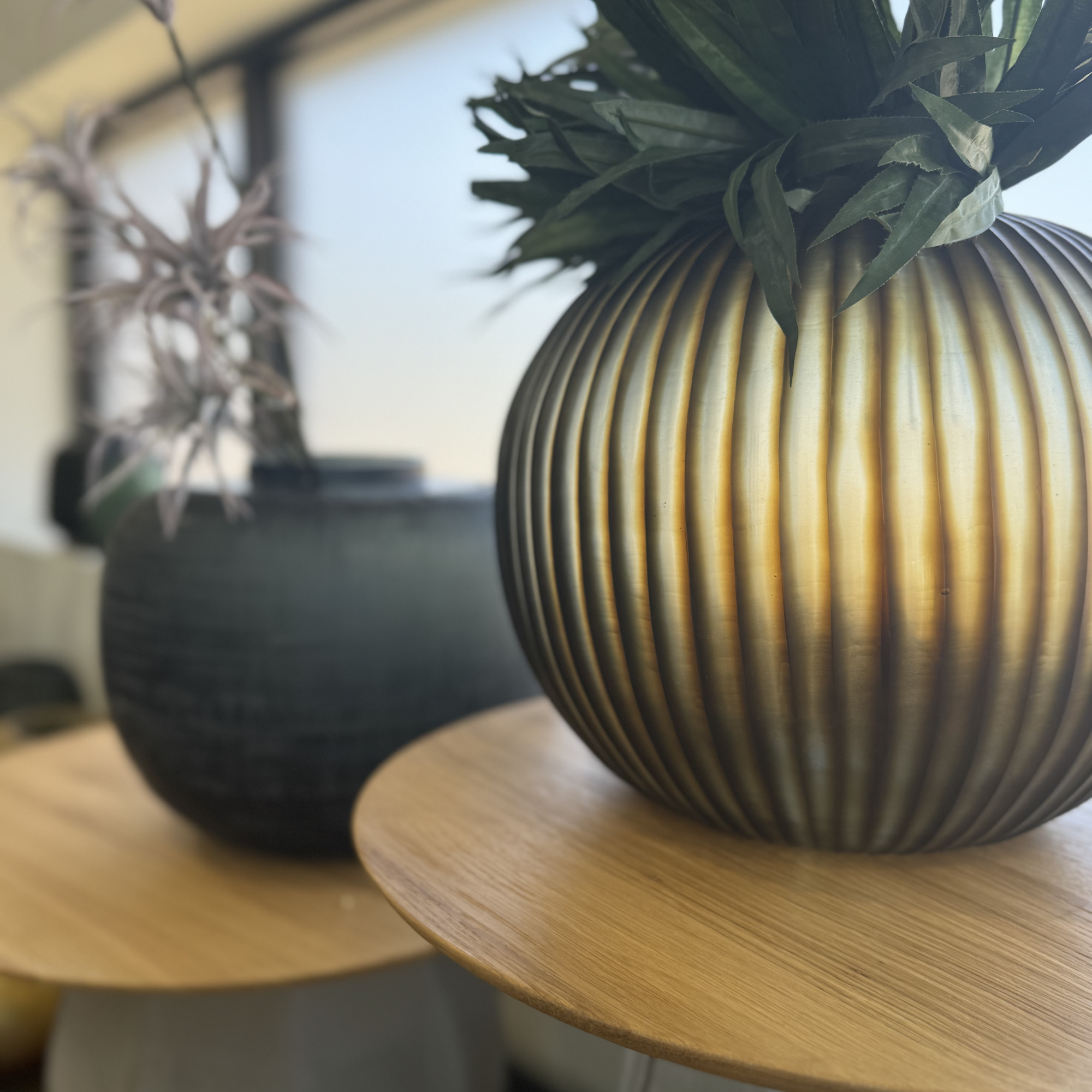 The Guaxs Gobi Round Vase features a refined pleated surface in a rare shade of Indigo Brown.
