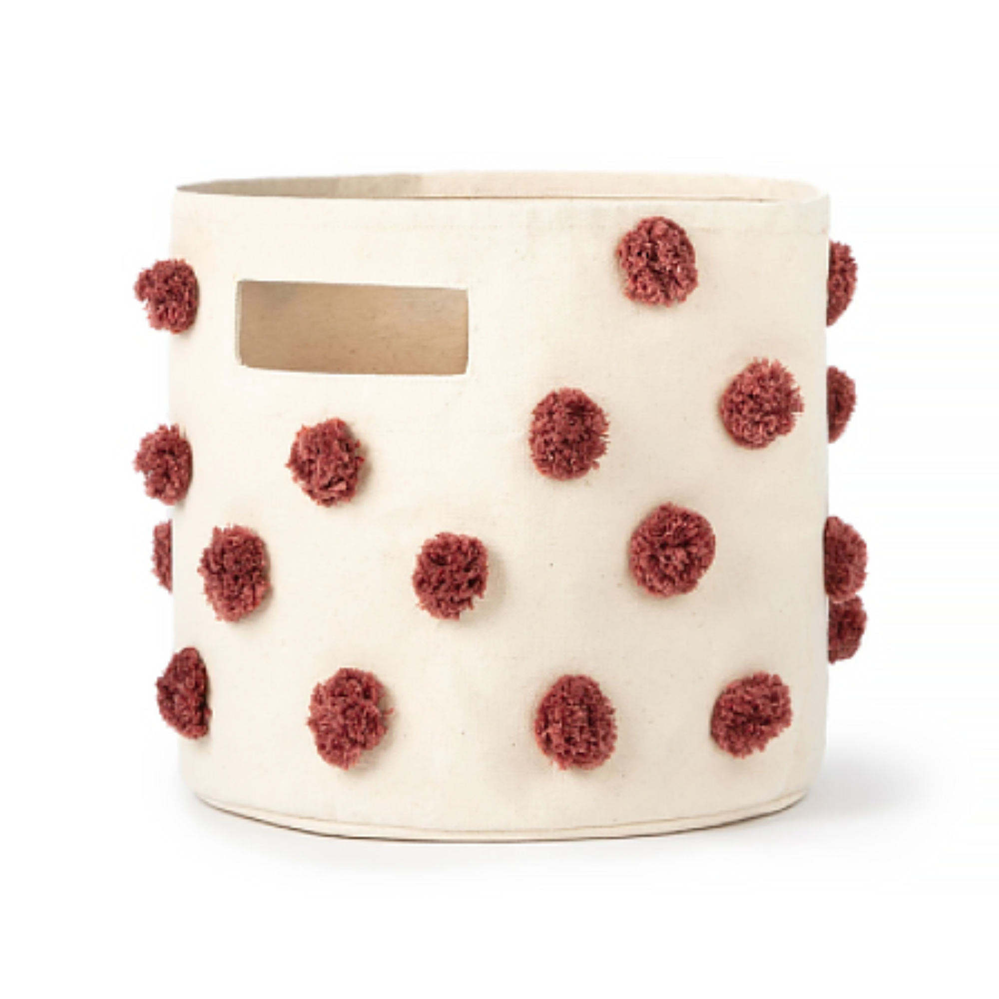 - Adorned with hand-sewn clay-colored pom poms