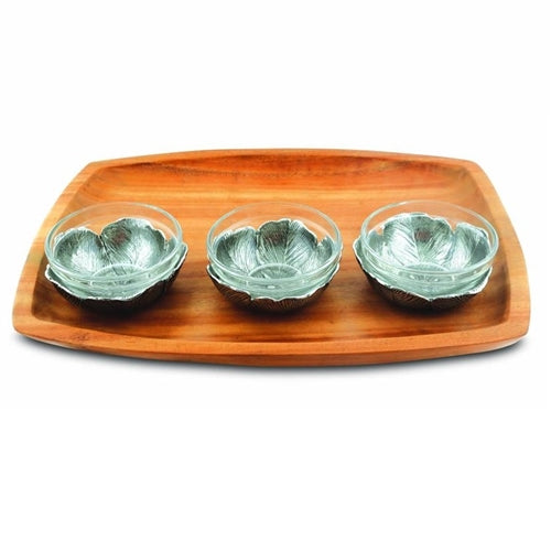 A floral fantasy for your table, the Vagabond House Poppies Tray is enhanced with 3 clear glass bowls that nestle into luxurious pewter chargers imagined as poppy blooms.